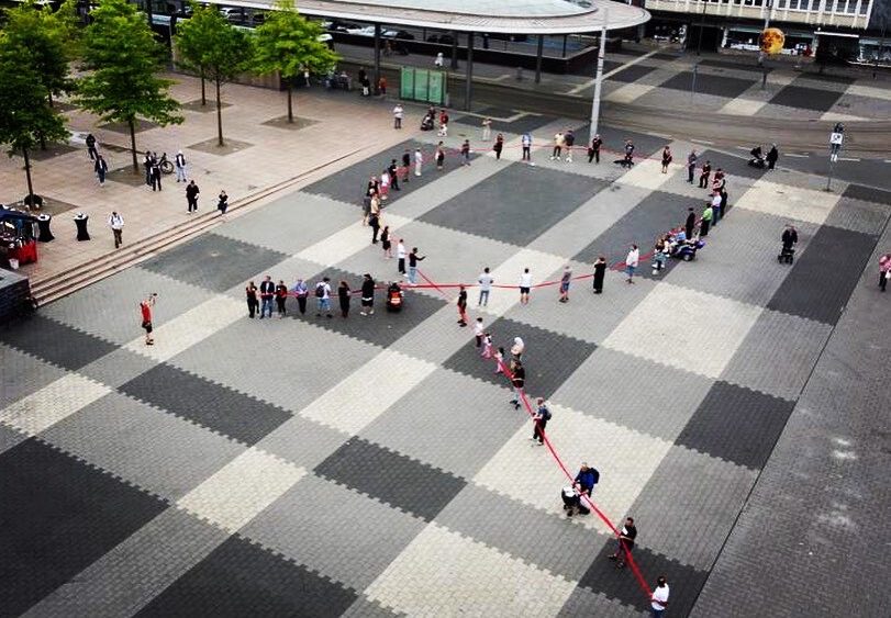 Auch Herner Bürger:innen sowie die Politik waren eingeladen, sich an der Aktion zu beteiligen. Es wurde mit Hilfe eines roten Stoffbandes eine Menschenkette in Form einer AIDS-Schleife gebildet.